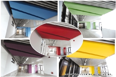5层艺术楼每层一个主色调,绿色、蓝色、紫色、红色、黄色。