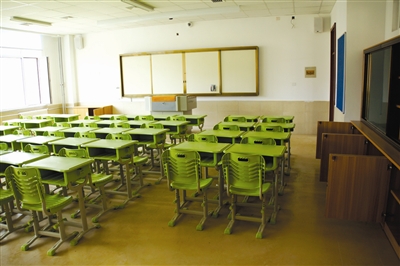 教室不再设有年级和班级的标签,而是以学科划分,这是青岛39中新校区最大的变革。换言之,学生上语文课会去语文教室,化学课会去化学教室,以此类推。在115个学科教室中,面积从90平方米到120平方米不等,既有语文、生物、英语等国家课程的教室,也有通用技术设计、汽车驾驶模拟与实训、陶艺等专门教室。每个学科教室都按照该学科的特色进行设计、装备,如历史教室装修风格古色古香,还将摆放中学教学相关的历史典籍。