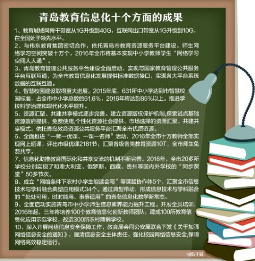 2016年5月,21世纪教育研究院、社会科学文献出版社联合发布的2016年教育蓝皮书对19个重点大城市义务教育均衡发展进行了调查,青岛市义务教育均衡总体满意度位居第一。“目前,教育信息化助推构建的‘智慧互联、优质均衡’的教育现代化格局正在形成,青岛教育信息化向着建成全国教育信息化示范区的目标不断迈进。”市教育局相关负责人表示。最近,教育部主管、教育部教育管理信息中心主办的刊物《基础教育参考》,全面推广了青岛市一年来教育信息化改革创新取得的经验,推出了本市教育信息化融合创新发展典型案例48个,涵盖区市推进、教育管理和教学融合等方面。