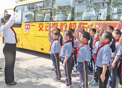 ■图:昨日,交运温馨校车公司随车照管员和学生一起系上红领巾,重温队史、入队誓词,共唱少先队队歌。 邢志峰 摄