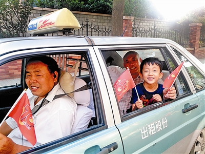 ■为纪念中国人民抗日战争暨世界反法西斯战争胜利70周年,铭记历史,缅怀先烈,青岛市出租汽车股份有限公司制作了一批手摇旗发放给乘客。傅学军 摄