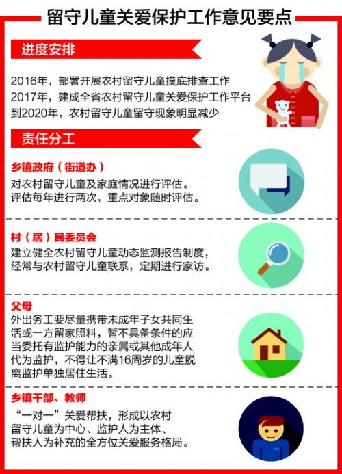 山东要求,通过政府购买服务方式,在乡镇(街道)设立农村留守儿童关爱保护专业干事,在村(社区)设立农村留守儿童关爱联络员。乡镇政府(街道办事处)要建立党员干部、教师等“一对一”的关爱帮扶制度,形成以农村留守儿童为中心、监护人为主体、帮扶人为补充的全方位关爱服务格局。
