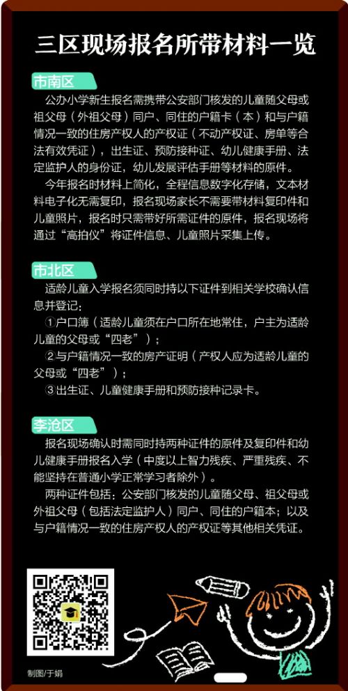 7月,除了高考填报志愿这件大事外,本市公办小学将开始报名、招生、录取等一系列工作。7月2日和7月3日是市内三区公办小学当地户籍儿童现场报名确认的时间,外来务工人员子女的现场报名确认时间则统一安排在了7月4日。三个区在所需带的证件以及相关要求上各有不同,需要学生和家长注意,提前准备好材料,以免影响入学。另外,记者了解到,根据市北区前期信息采集的统计信息,该区目前有一半多的适龄儿童是外来娃。