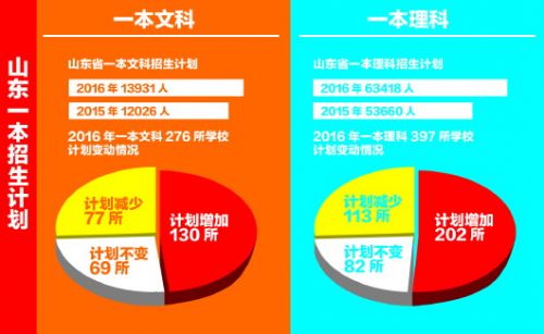 2016年,山东省本科一批文科招生计划为13931人,与去年12026人的计划相比,增加1905人;本科一批理科招生计划为63418人,与去年53660人相比,增加9758人。