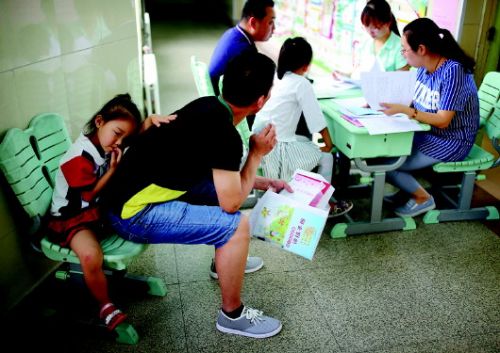 7月4日,李沧第二实验小学入学登记点,家长带着孩子前来报名。