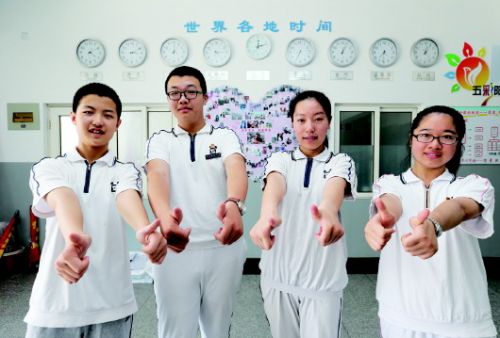 超银中学韩庸平、周学睿、赵然、林海轩(从左至右)四位高分考生合影。 本报记者孟达 摄