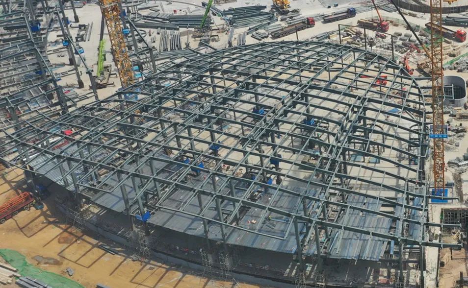 随着综合馆地下室主体结构全面冲出正负零,4月17日,元素区三区地上钢结构施工已全部完成。目前,元素区地上结构、地下室外墙防水,地下室砌筑等施工工序高效穿插进行,为全面推进项目高效履约奠定了坚实的基础。
