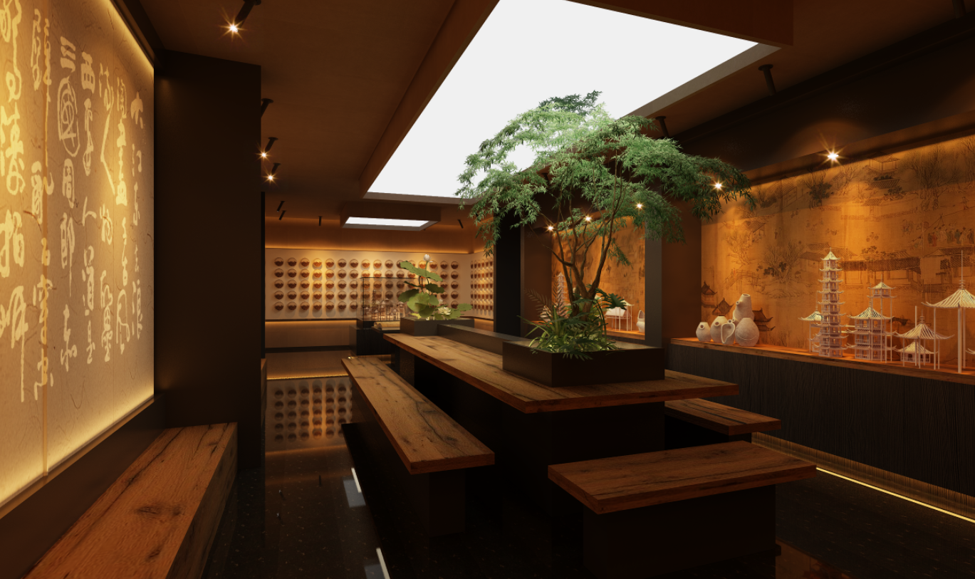 而除了产品之外,走进每家门店,扑面而来的就是浓郁的中国文化气息,门店整体以宫墙红和荷田绿为主色调,装饰以复古金搭配胡桃木纹为主,点单区挂着饮品敦煌杏皮水、阿胶姜枣茶、羽衣素颜水的招牌,从视觉设计到产品都是满满的国潮元素。