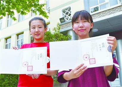 早报讯 2016年高考提前批录取结束,录取通知书也将要陆续送到考生手中。昨天上午,青岛17中的祝铭慧和孙悦奇都收到了中国人民大学设计类专业的录取通知书。她们读高中时是同班同学,进入大学依然是同班同学。两人对即将到来的大学生活,也是充满了向往。
