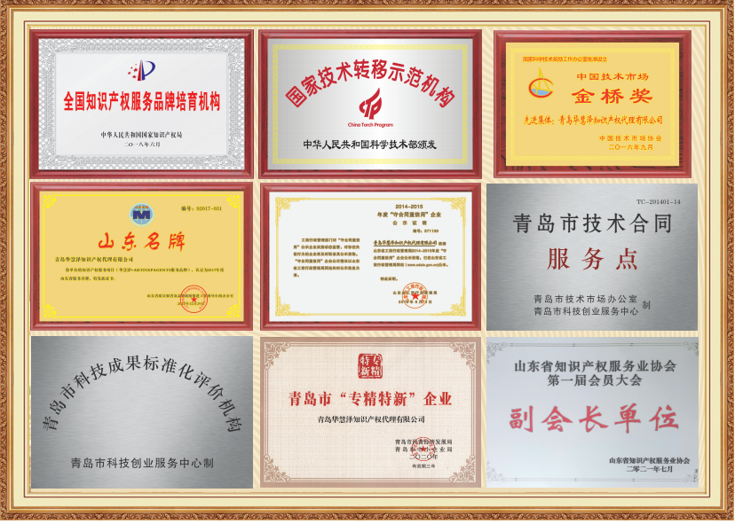 华慧泽公司先后荣获“全国知识产权服务品牌培育机构”“国家技术转移示范机构”“国家海洋技术转移中心专业领域分中心”“中国技术市场金桥奖先进集体奖”“山东省服务名牌”“山东省知识产权服务业协会副会长单位”“山东省守合同重信用企业”“山东省高端品牌培育企业”“青岛市技术合同服务点”“青岛市科技成果标准化评价机构”“青岛市国际科技合作基地”“青岛市专精特新企业”等资质和荣誉。