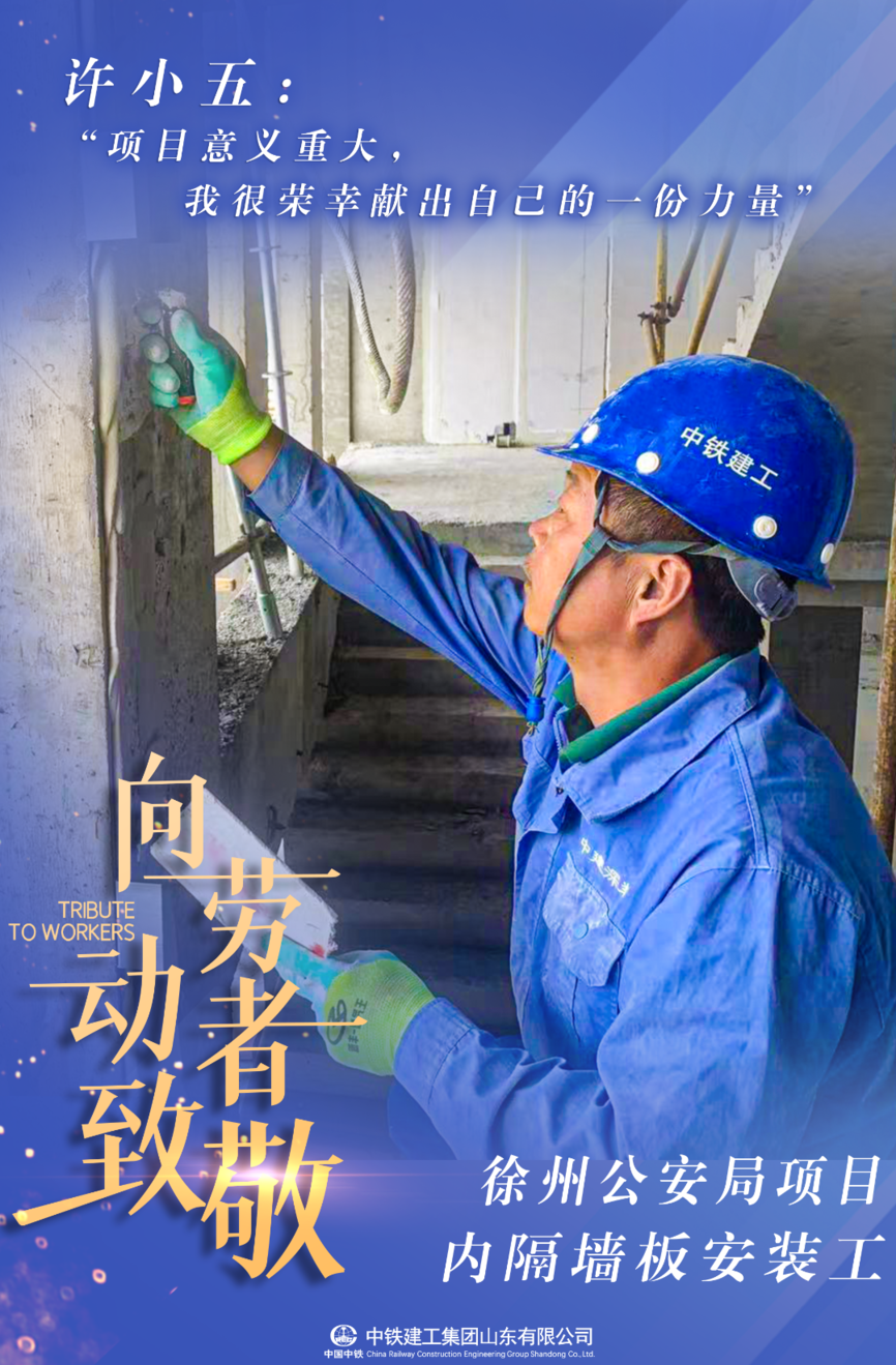 来自江苏省徐州的许小五,是徐州市公安局新建业务技术用房项目内隔墙板安装班组的一名成员,主要负责板材的楼内运输,人工与机械的相互配合安装与成品保护。他说,“我参建的项目意义重大,我很荣幸为项目建设献出自己的一份力量!”