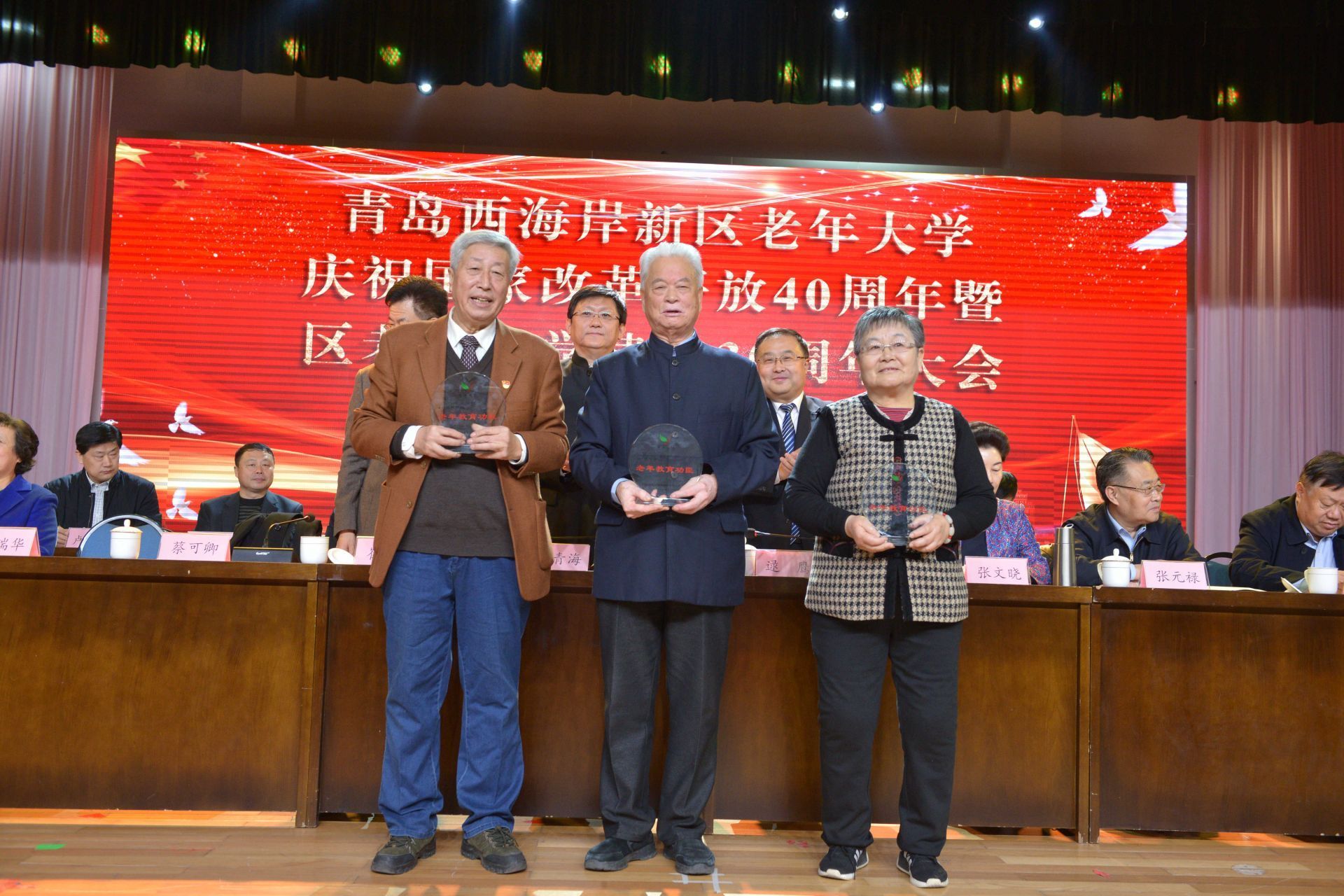 西海岸新区老年大学建校30年,首任校长蔡可卿(中)等荣获“老年教育功臣”称号