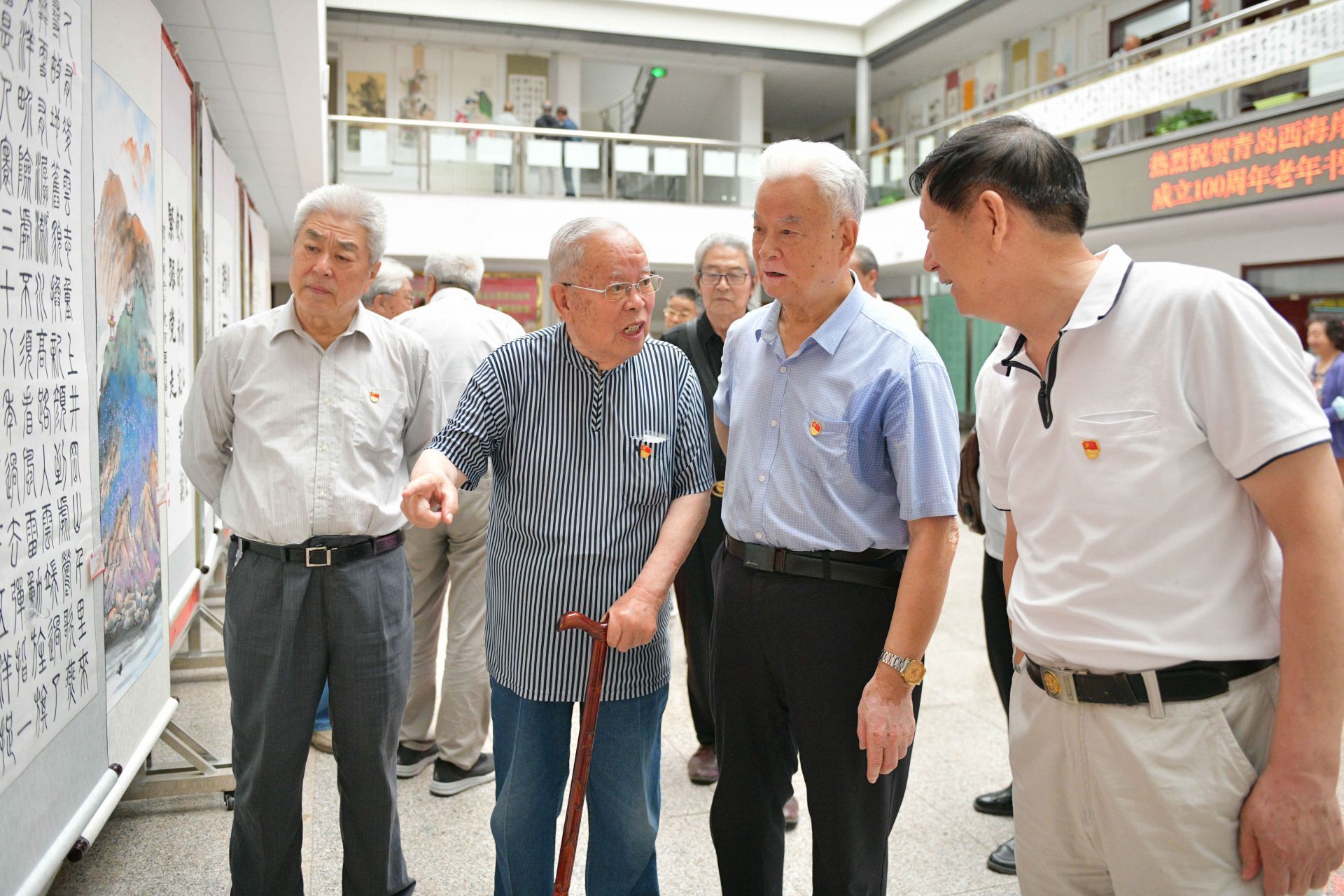 西海岸新区老干部书法协会顾问蔡可卿(右二)观看庆祝建党百年老年书画作品展
