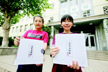 本报7月14日讯(记者 张晓鹏 通讯员 车巾) 大部分高考生还没填完志愿,14日,已经有首批高考录取通知书抵青。17中两名同班女生孙悦奇和祝铭慧接到人民大学的录取通知书,据悉,今年人大设计类专业在山东省仅招7人,她们就占了两个名额。