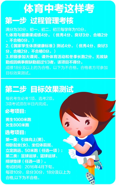 根据规定,2016年全市所有初中毕业生均须参加初中体育与健康学业考试。记者梳理发现,明年的体育中考不再是临考三个月前通过抽签摇号方式确定第二、三类考试项目,而是在2015年10月30日提前公布了考试项目和考试时间,给考生留出了充分时间准备和锻炼。测试标准恢复了国家标准,不再降低测试标准。