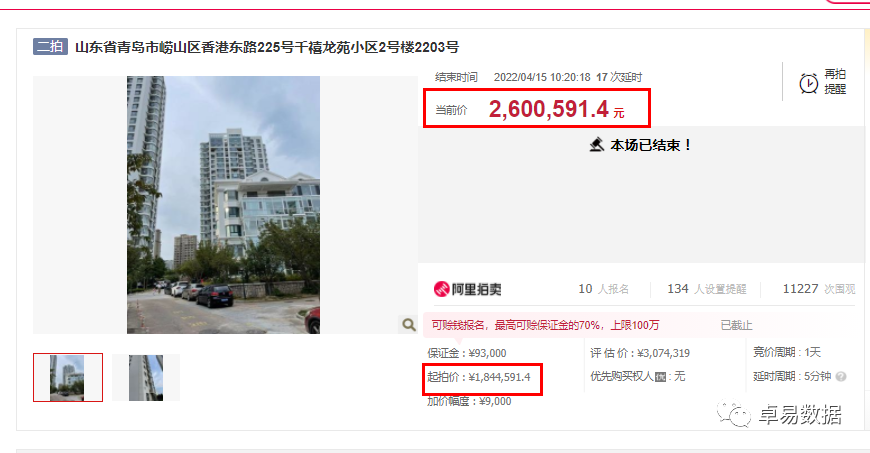 激增的法拍房态势之下,青岛法拍房的市场情况如何?据卓易数据研究报告显示,法拍房价格普遍低于商品房市场价,青岛有的房源仅为市场价6成。王玟琳介绍说,例如崂山石老人千禧龙苑一套80㎡的22层住宅(含一个车位),起拍价184万,折合单价2.28万,而根据链家二手房报价同样80平左右的高层房源,报价在4万左右,法拍起始价仅为市场价的6成左右,当然因为价格低廉,10个人报名30轮叫价,最后成交折合价3.22万,也相当于市场的8折。