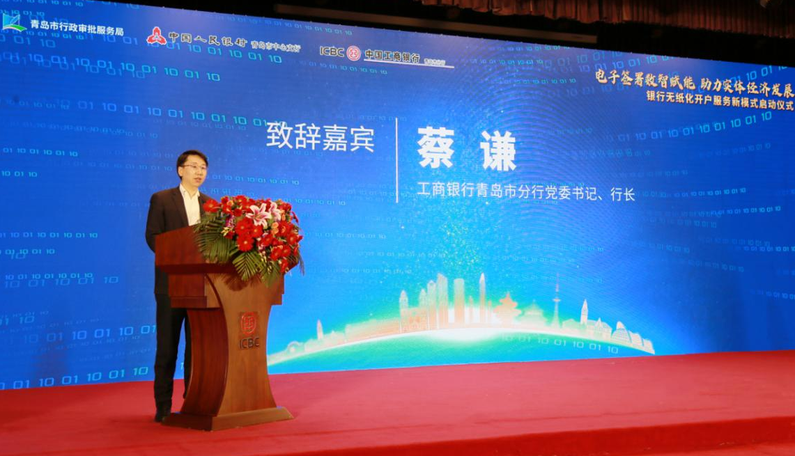 青岛工行行长蔡谦在致辞中表示,无纸化开户服务模式首发落地,是电子印章在金融领域应用的有益尝试和重大创新,对于全面提升金融服务实体经济质效,支持民营企业和小微企业高质量发展具有现实意义。