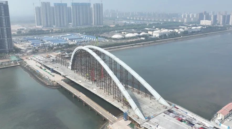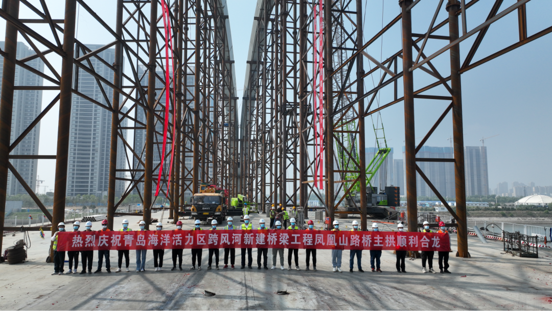5月29日8时58分,由中建八局发展建设公司承建的青岛海洋活力区跨风河新建桥梁工程建设迎来新进展——凤凰山路跨风河大桥钢拱肋主拱顺利合龙。