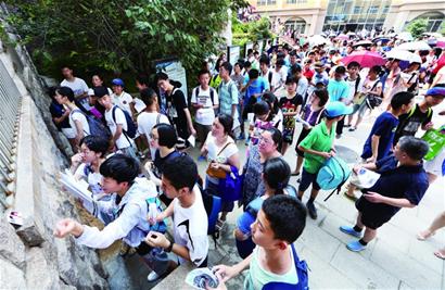 昨日是岛城各高中高一新生入校看榜、领取录取通知书的日子。上午8时50分,全城已经进入“蒸笼模式”,在青岛二中媒体中心外的平台上,数百名家长和学生顶着日头在排队等待领通知书。而在青岛实验高中,匆匆看完榜的新生纷纷玩起“快闪”,迅速撤离校园。 “这么热的天,学生和家长大老远跑过来真是没必要,这些手续大部分都可以在网上办。 ”二中新生家长张女士建议新高一报到手续可以更多在网上完成,免除学生和家长的奔波和等待之苦。 □青岛晚报/掌上青岛/青网 记者 王晓雨 徐美中