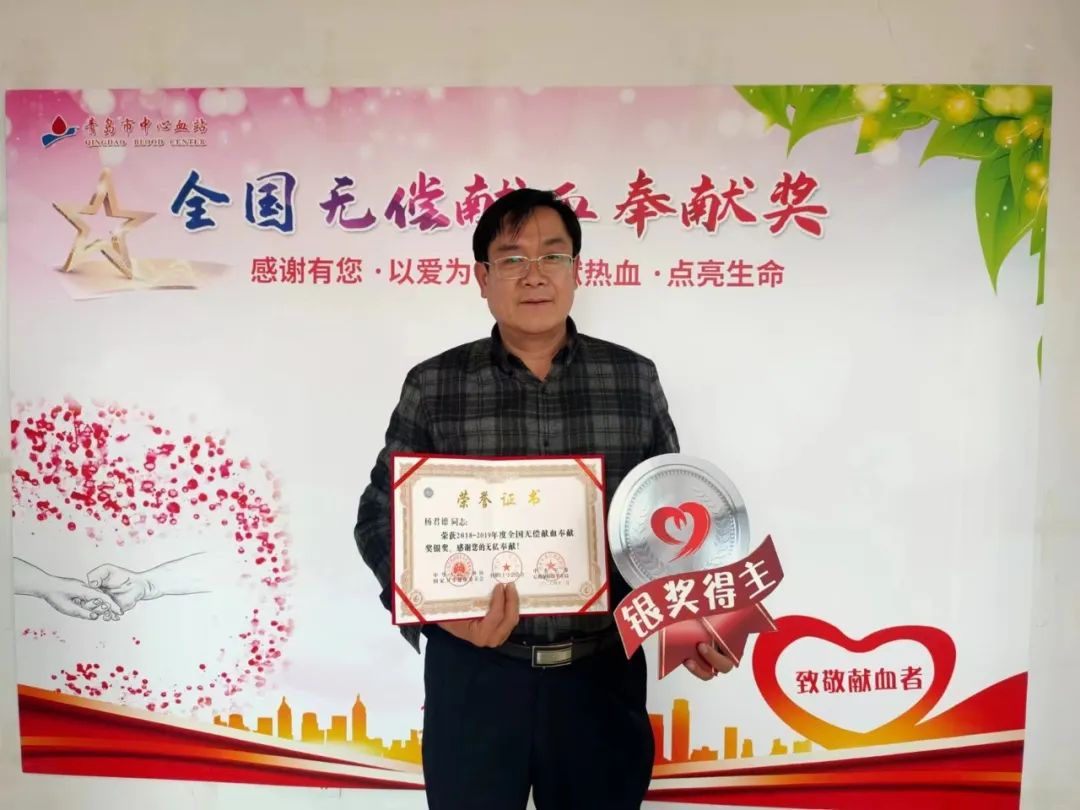 早在2008年开始,杨君德就自愿加入全血献血行列,只要血站有用血需要,他就随时伸出援助之手,至今献血总次数22次,全血献血总量8400毫升,相当于2个成年人的血量。因全血献血每次要间隔半年时间,而成分献血(血小板)可以每月一次,为了帮助更多的人,从今年4月开始,杨君德又加入了成分献血(血小板)的行列中,如今他的成分献血总量已有2个治疗量。