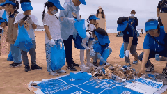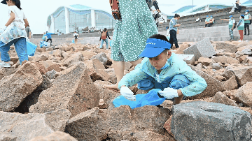 小卫士们有的两两一组,一个拿着垃圾袋,一个捡垃圾,有的和家长互相配合,有条不紊地清理海边漂流废弃物和白色垃圾。