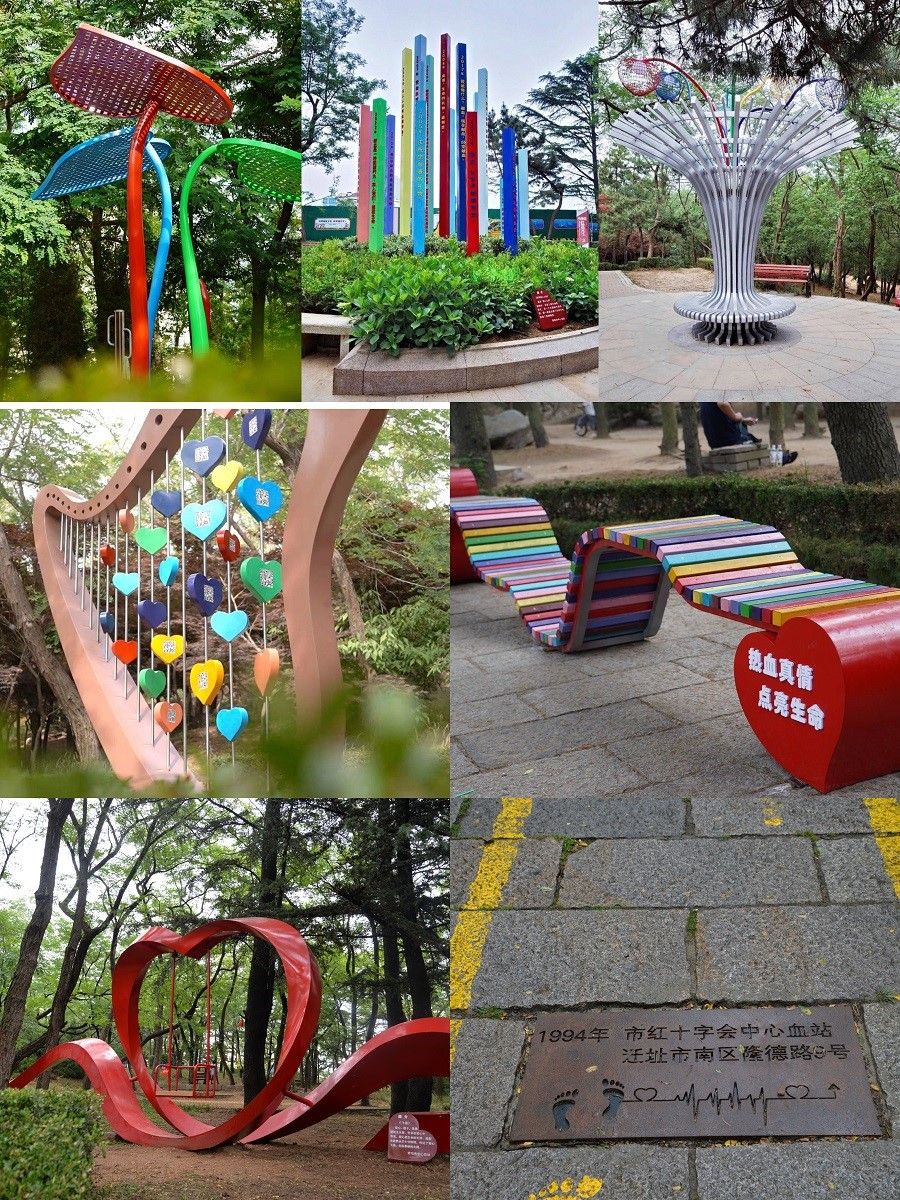 其中,“一线”即利用公园现有的环山步行道,在青石板路上用钢板刻字,书写了1993年至2021年的青岛市无偿献血大事,打造热血历程。“四区”分为主题展示区、健康运动区、家庭亲子区、林荫休闲区。“九点”即在九个节点增设了众多特色景观小品和雕塑,不仅有景观性,而且还有科普性、互动性和实用性。比如景观《律动》就是一处全媒体互动型科普打卡点,主体为竖琴造型,内部设置多个爱心魔方,每个魔方都有二维码,市民扫码就可以了解献血须知、献血预约、血费报销、三免政策等。