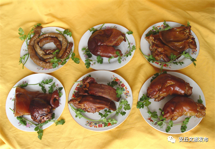 芝泮烧肉,是山东省安丘市传统名吃,生产于安丘市景芝镇芝泮村。其主料是猪头、猪肠、猪肚、猪蹄、猪心、猪肝、猪肺等。采用明朝宫廷膳食秘方,添加20多种中药,经洗、揉、煮、熏、烤等多道工序加工而成,距今已有600多年的历史,制作时,先用细盐轻搓几遍,然后放入原汤锅中,煮两小时左右,煮时放入用纱袋包好的豆蔻、砂仁、肉桂、八角、茴香等佐料。出锅以后,还要经过一个重要的工序,就是用白糖受热产生的烟气来熏烤,使肉质增加特殊的口味,这也是芝泮烧肉口味独特的妙处所在。可谓,绝世美味,人间烟火。