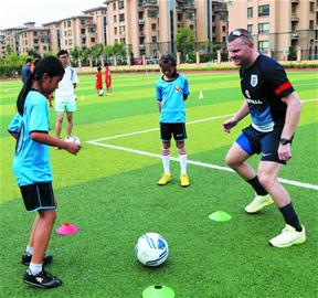 英国教育联盟足球教练课程总监斯蒂芬·达利来到青岛传授足球技巧。