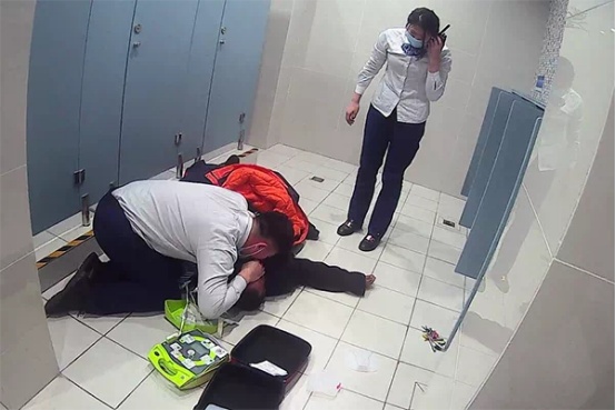 2022年1月5日,1号线山里站站台男卫生间发生乘客晕倒情况,站台岗迅速上报车站控制室,车站随即启动应急救援程序,车站值班站长郭守花与厅巡岗邵钰卿迅速响应赶到现场。“先生,你能听到我说话吗?听到你动一下手指。”乘客对郭守花的询问没有任何反应后,邵钰卿侧头趴到乘客嘴边,望向他的胸口——感受不到呼吸,胸口没有任何起伏。“没有呼吸,没有心跳,符合使用条件,上AED!”话音刚落,邵钰卿就拿起剪刀将乘客衣服剪开,为乘客贴上AED电极片。