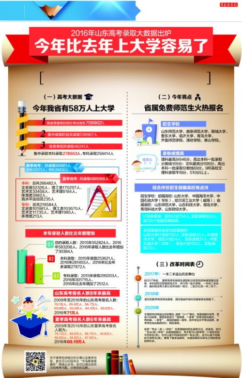 8月15日,省教育厅组织了新闻发布会,具体公布了山东省一系列高考录取数据。截至8月15日,我省2016年普通高校招生常规阶段录取工作圆满顺利完成。今年我省普通高校招生考试报名709902人,为八年来最高。我省本专科的录取人数也增加了3万多人。高考录取人数稳中有升、本科录取人数稳中有升、优质本科录取人数稳中有升。