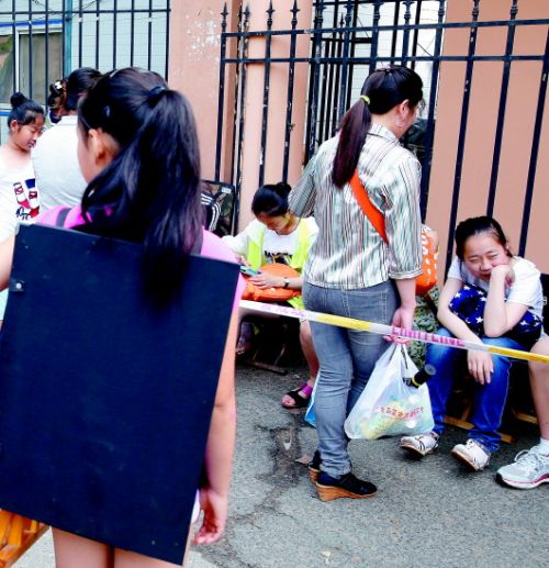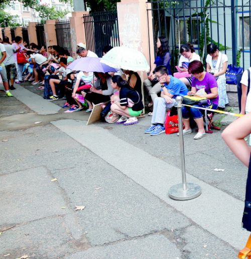 2015年7月13日,青岛艺校大连路校区门口,等候考级的考生在排队准备进场考试。(资料图片) 文/半岛记者 刘雪莲 图/半岛记者 孟达