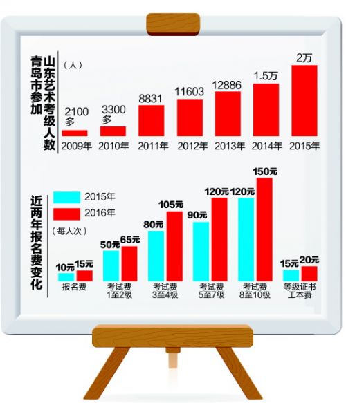 从2009年的2000多人,到2015年的2万人,6年时间青岛艺术考级人数增长了约9倍。