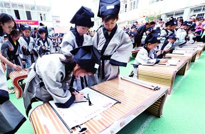 近日,福州路小学的学生用“开笔礼”开启了小学第一天。老师击鼓三声,以示学生从今启蒙;一名老师手握毛笔,蘸上墨汁,苍劲有力地写下一撇一捺,一个气宇轩昂的“人”字跃然纸上。随后,孩子们学着老师的样子认真地在面前的描红纸上写下了同样的字。以示启蒙阶段就要做个真正的人,高尚的人,有修养的人,有文化的人,能掌握现代技术的人。