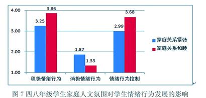 监测发现,大多数学生的家庭和睦,仅有12.6%和19.5%的四年级、八年级学生家庭人际关系较为紧张,具体表现为父母之间、亲子之间冲突较多,父母倾听较少、容易对孩子发火,孩子也不愿与父母分享和沟通。较为紧张的家庭关系会带来孩子更高的焦虑和抑郁情绪,降低孩子的幸福感,而且受父母的影响,学生的情绪、行为控制能力也较弱。