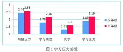过多的课业负担并不会有效提高学生的成绩,反而会减少学生的睡眠和运动时间,不利于学生的健康成长和全面发展。四年级、八年级学业压力水平较高的学生的平均数学成绩比压力水平较低的学生分别低10分和52分。