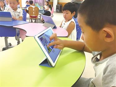 弘德小学一年级新生体验用iPad回答问题。