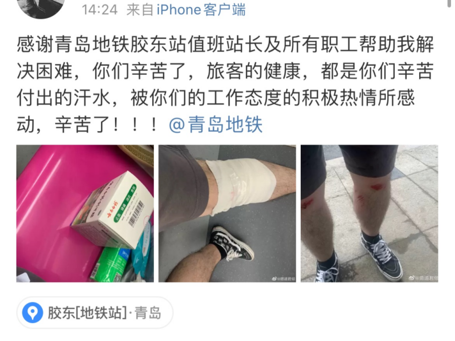 仅用几分钟,王建禹就包扎好乘客膝盖上的伤口,考虑到乘客近期还需进行伤口处理和绷带更换,王建禹将一些绷带和消毒类物品赠予乘客。原以为这不过是举手之劳,没想到乘客当天就通过微博对车站服务表示感谢。