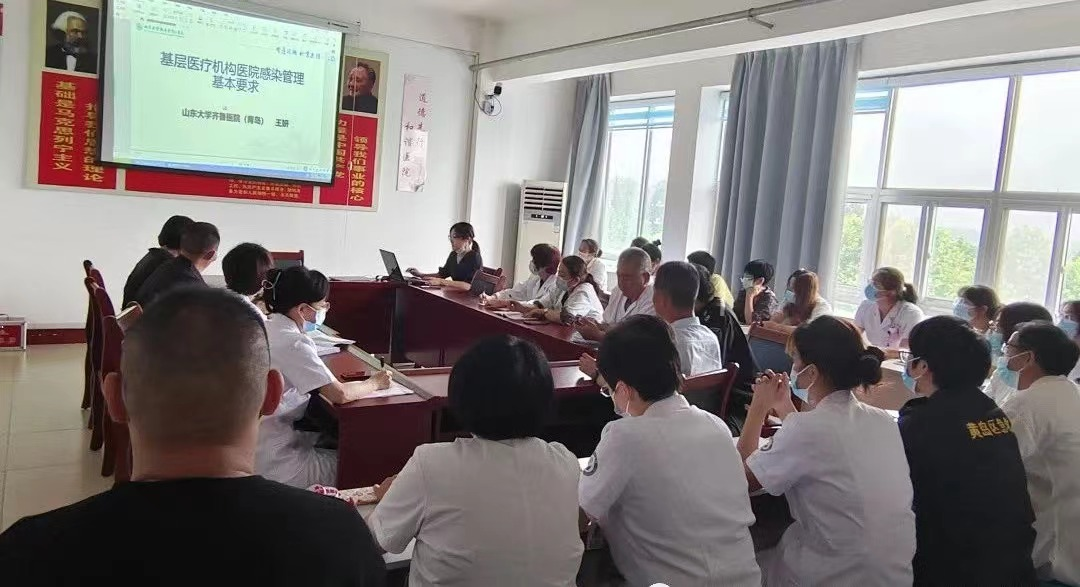 此次培训由山东大学齐鲁医院感染科主治医生、大村中心卫生院挂职业务院长王妍进行授课,主要针对基层医疗机构医院感染管理基本要求、组织管理要求等内容作了细致讲解。大村中心卫生院院长结合目前卫生院工作中存在的问题进行了剖析,并根据近期疫情防控工作要求提出预检分诊、日常消毒隔离、个人防护等院感管理意见。