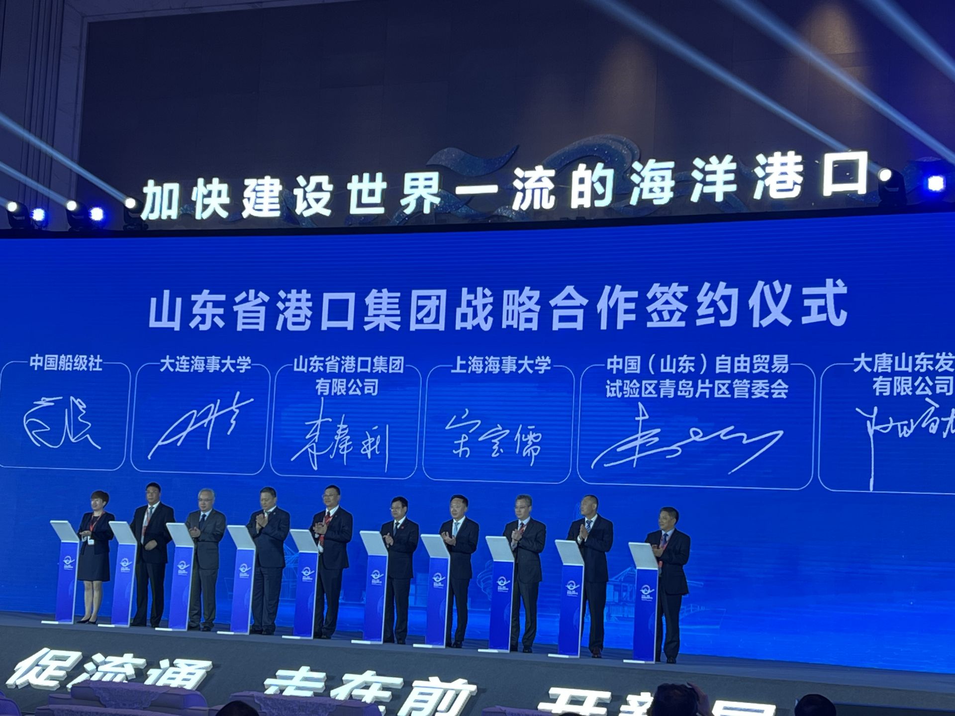 重大项目是拉动经济回升、稳住经济大盘的“强心剂”和“压舱石”,也是支撑山东港口“东西双向互济,陆海内外联动”,全面提升陆海双向通达能力的重要因素。8月15日,在2022青岛·陆海联动研讨会上,山东港口举行了重大项目宣讲推介和签约。山东港口青岛港、日照港、烟台港、渤海湾港四个港口集团进行了港口类项目签约。山东港口港湾建设集团、产城融合集团、物流集团、邮轮文旅集团、贸易集团、海外发展集团、职教集团等11个板块集团进行了新兴产业类项目签约。