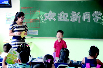 文登路小学一年级新生在开学第一课上做自我介绍。