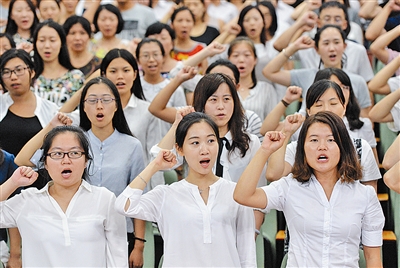 图为近600名中小学新任教师、青年教师代表面向国旗庄严宣誓。 周光辉 摄