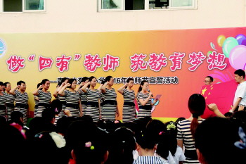 “我是一名光荣的人民教师,我庄严宣誓:忠于人民的教育事业,履行教师的神圣职责,贯彻国家教育方针,全面实施素质教;热爱学生,为人师表……”9月4日,青岛文登路小学举行了“做四有教师 筑教育梦想”教师节宣誓活动。在校长朱雪梅的带领下,文登路小学73名教师面向国旗做出庄严承诺。全体学生见证了这一庄严的时刻。