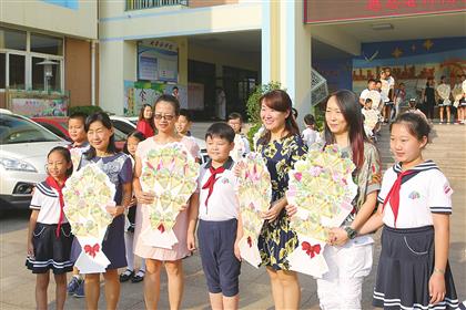鞍山二路小学的老师们手捧学生送的感恩的“馨”。
