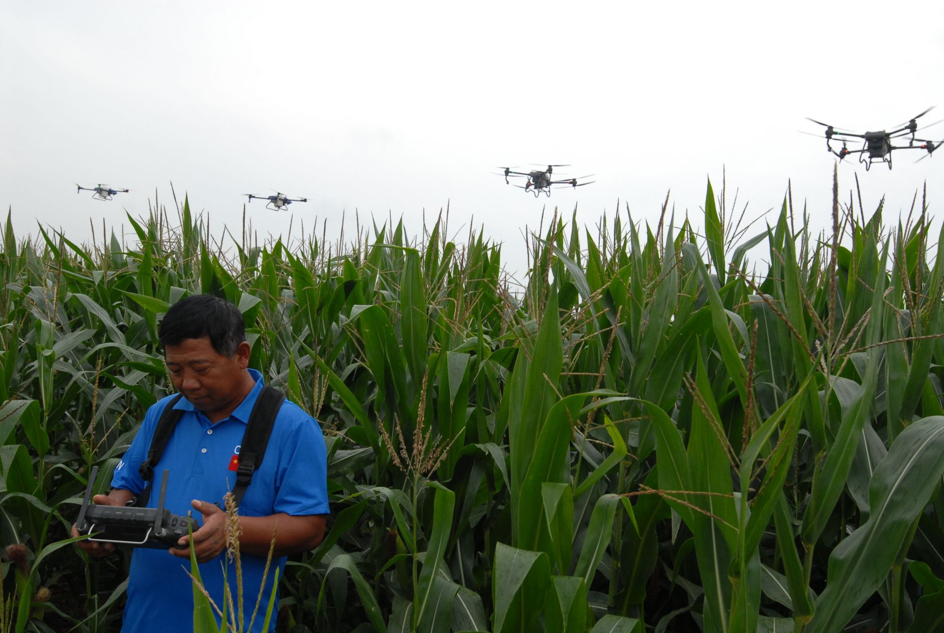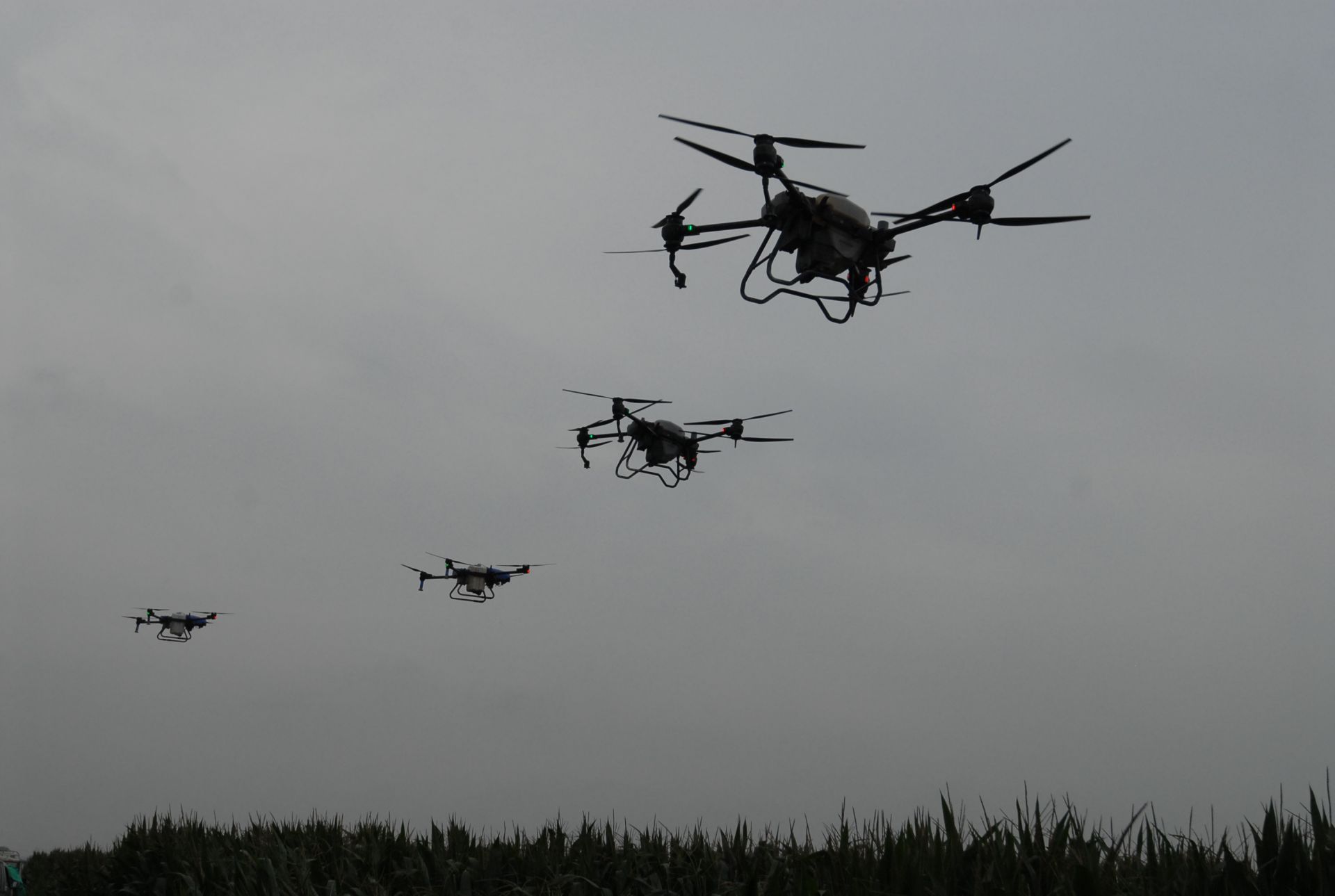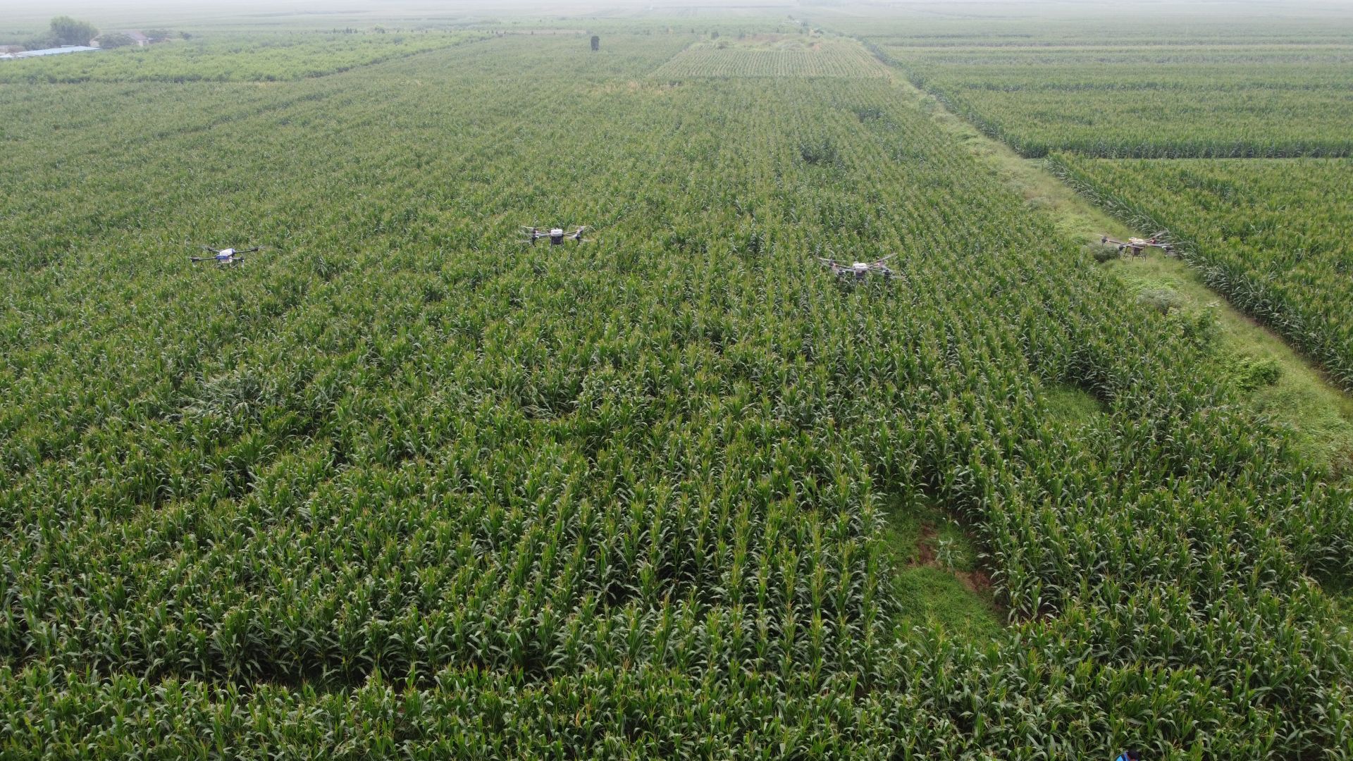 8月30日,在山东省青岛市即墨区灵山街道于家辛庄村,五架无人植保机开始对玉米地块进行飞防作业。