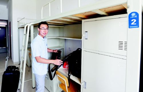 ◤来自山西的新生张瑞峰刚来到宿舍,准备摆放自己的物品。