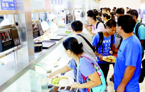 ◥餐厅内,学生和家长、教职工排队取餐。