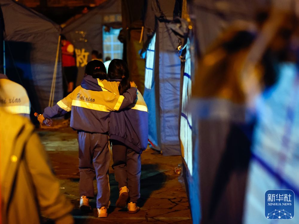 9月5日晚,在四川甘孜州泸定县磨西镇的受灾群众临时安置点,两名学生走在帐篷之间。