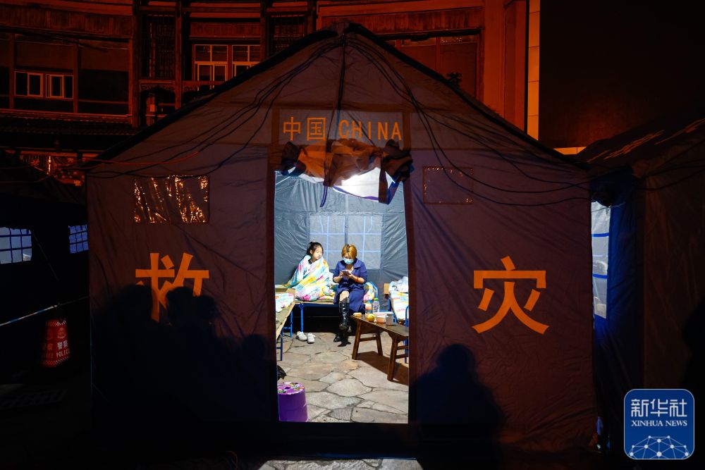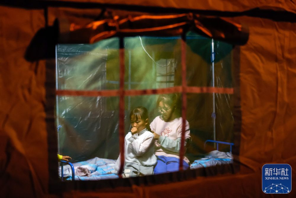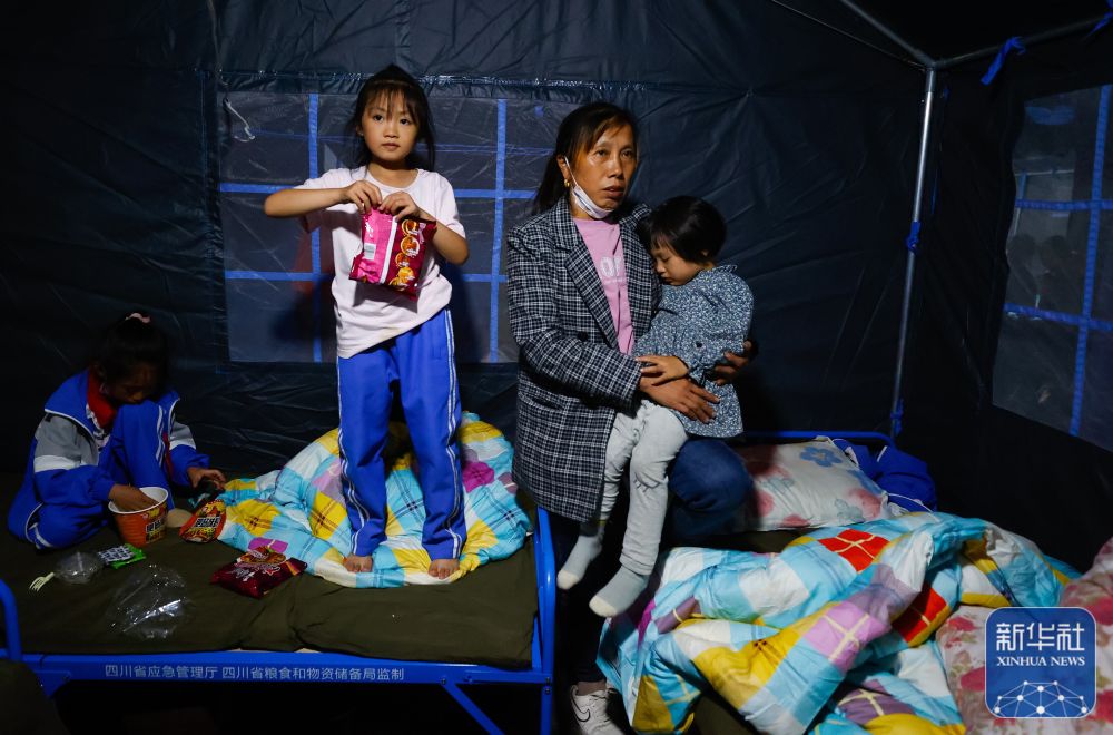 9月5日晚,在四川甘孜州泸定县磨西镇受灾群众临时安置点,两名小女孩在帐篷里。