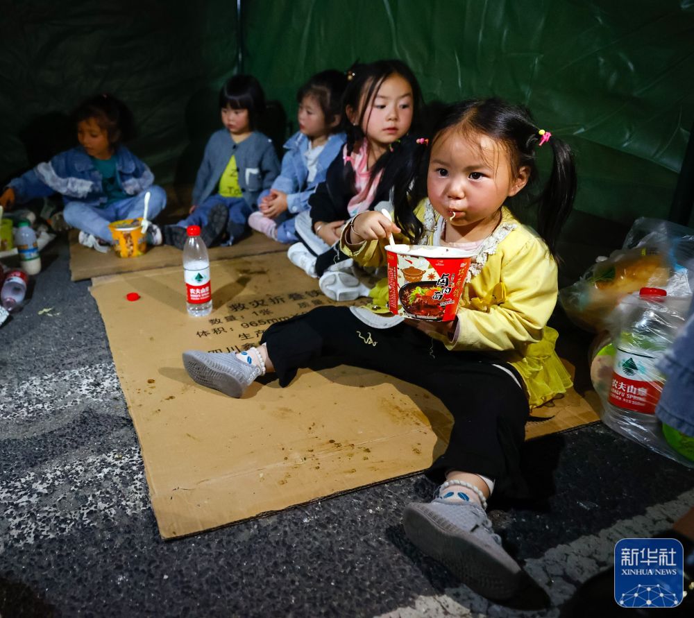 9月5日晚,在四川甘孜州泸定县磨西镇的受灾群众临时安置点,几个家庭的孩子们在一个帐篷里吃饭、休息。