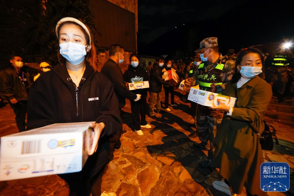 9月5日晚,在四川甘孜州泸定县磨西镇的受灾群众临时安置点,人们在传递救灾物资。